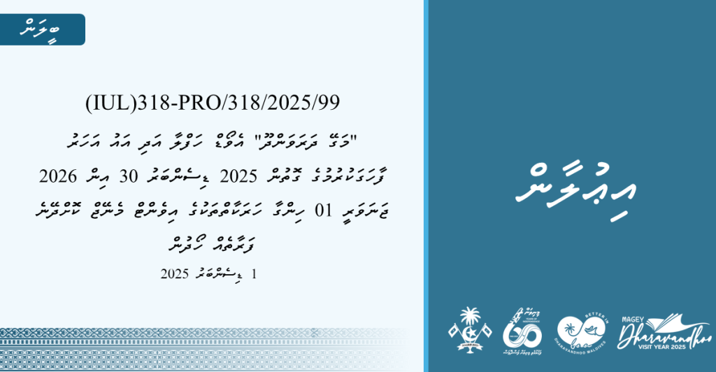 ”މަގޭ ދަރަވަންދޫ“ އެވޯޑް ހަފްލާ އަދި އައު އަހަރު ފާހަގަކުރުމުގެ ގޮތުން 2025 ޑިސެންބަރު 30 އިން 2026 ޖަނަވަރީ 01 އަށް ހިންގާ ހަރަކާތްތަކުގެ އިވެންޓް މެނޭޖް ކޮށްދޭނެ ފަރާތެއް ޝައުޤުވެރިވާ ފަރާތްތަކަށް ބީލަން ހުށަހެޅުމުގެ ދަޢުވަތު އަރުވަމެވެ.